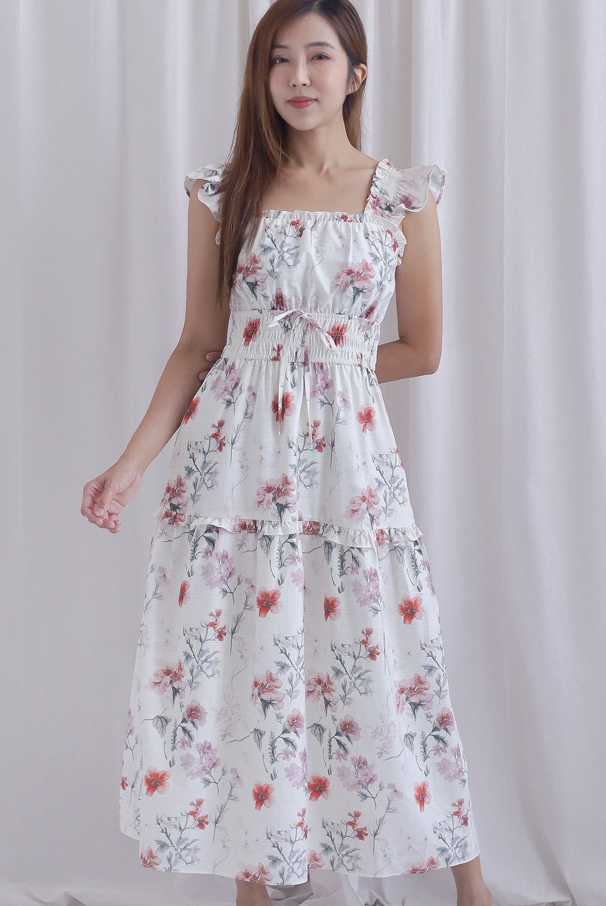 Aurell Thick Waist Ruffle Sleeve Maxi Dress In White Floral