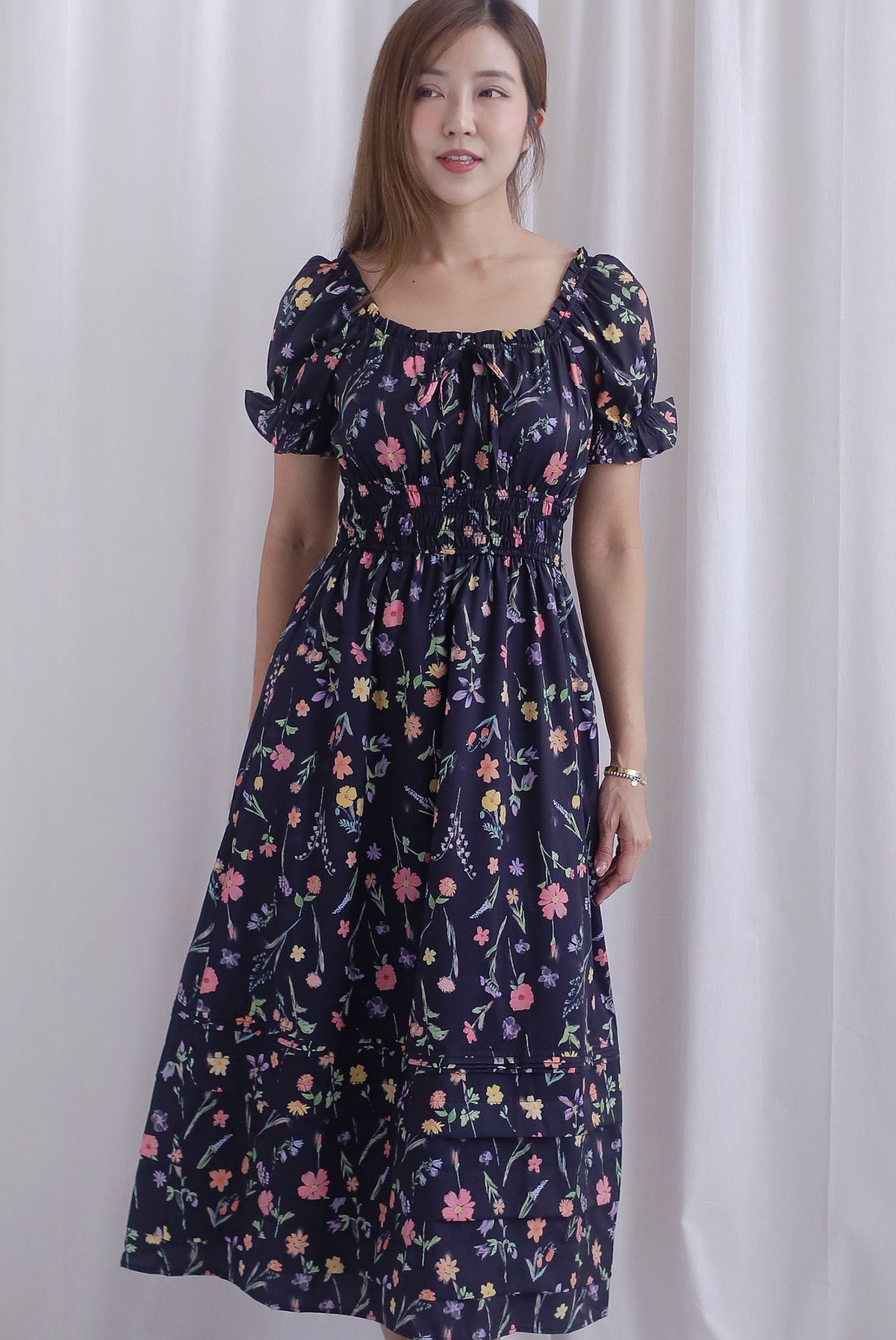 Victorian Vine Embro Square Neckline Maxi Dress In Navy Blue
