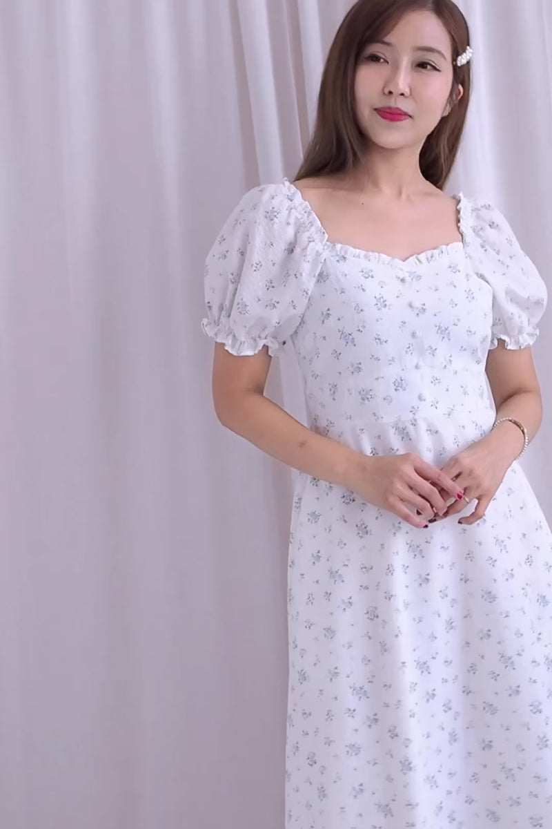 Chandra Frill Floral Gingham Sleeved Midi Dress In White